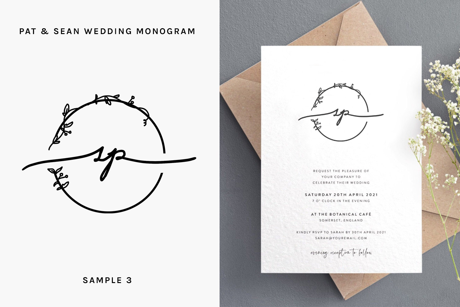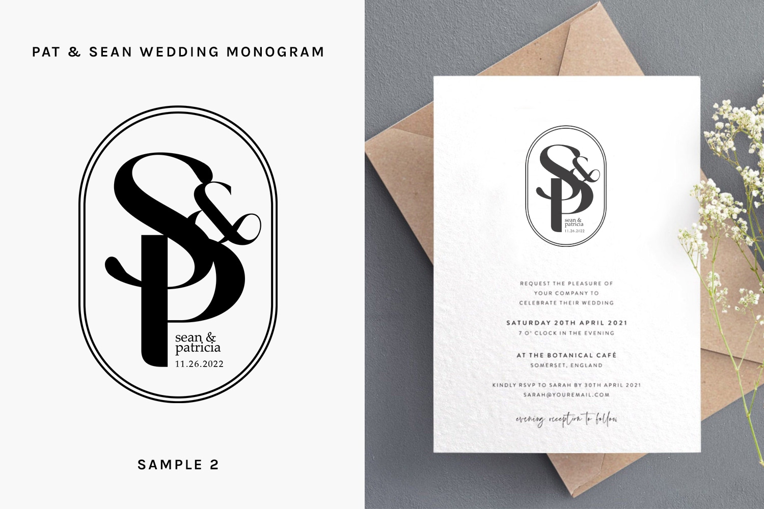 Sean and Patt needed a wedding monogram designed in time for their wedding. We’ve created multiple concepts and mockups that would help them decide on which monogram design to use for their wedding.
